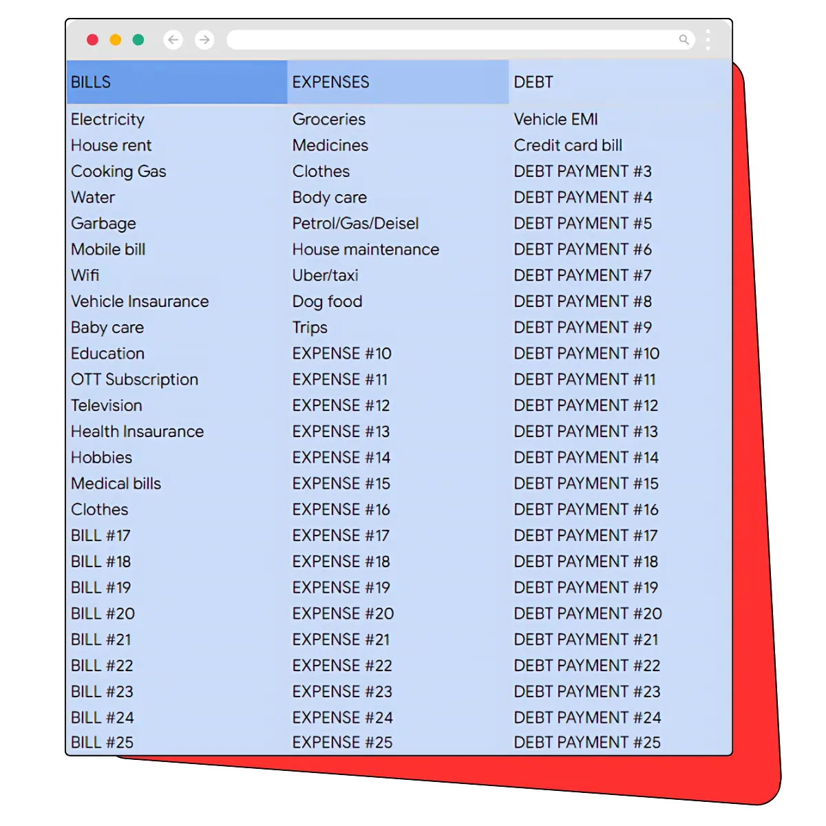 Our spreadsheet is designed to be flexible. You can add as many categories as you need, whether it's for additional bills, expenses, or debts. Every field is completely editable.